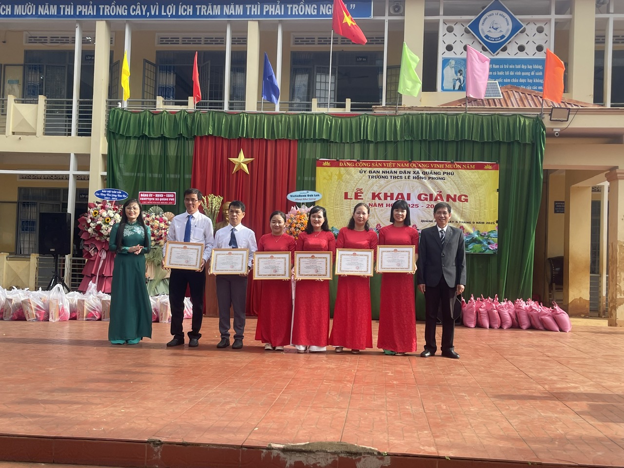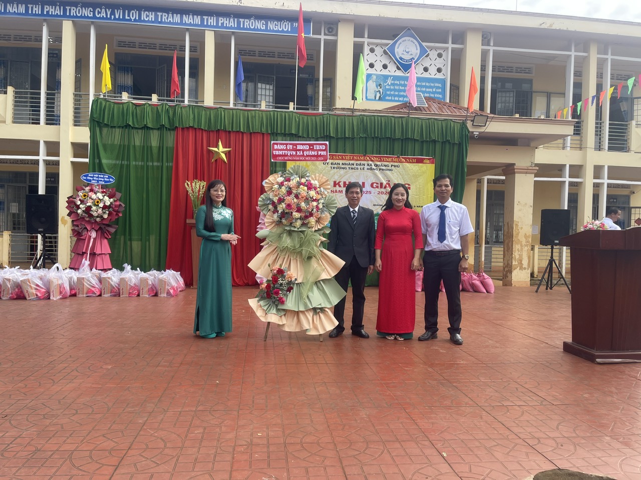 Sáng ngày 05/9/2025, hòa chung không khí rộn ràng của cả nước chào mừng năm học mới và kỷ niệm 80 năm thành lập Bộ Giáo dục và Đào tạo, thầy và trò Trường THCS Lê Hồng Phong long trọng tổ chức Lễ khai giảng năm học 2025 – 2026. Buổi lễ được tổ chức ngắn gọn, trang nghiêm nhưng vẫn đầy ý nghĩa. Đại diện Hiệu trưởng nhà trường trân trọng tuyên bố lý do, giới thiệu đại biểu. Trong phần nghi thức trọng thể, đại diện lãnh đạo xã Quảng Phú tặng hoa chúc mừng của Đảng ủy, HĐND, UBND, UBMT xã Quảng Phú. Tiếng trống khai trường vang lên rộn rã, mở ra một năm học hứa hẹn nhiều thành công. Đặc biệt, nhà trường còn tổ chức trao quà cho học sinh có hoàn cảnh khó khăn, thể hiện tinh thần nhân ái, sẻ chia. Sau phần lễ nội bộ, thầy và trò tham gia kết nối trực tiếp với Lễ khai giảng toàn quốc tại Trung tâm Hội nghị Quốc gia qua sóng VTV1, cùng lắng nghe phát biểu của lãnh đạo Bộ Giáo dục và Đào tạo, lãnh đạo Đảng, Nhà nước, và chứng kiến Tổng Bí thư đánh trống khai trường. Buổi lễ khép lại trong niềm vui, niềm tin và khí thế hăng hái. Ngày khai giảng năm học 2025 – 2026 đã để lại trong lòng thầy và trò Trường THCS Lê Hồng Phong nhiều ấn tượng sâu sắc, mở đầu cho một chặng đường học tập mới đầy hứng khởi và thành công.