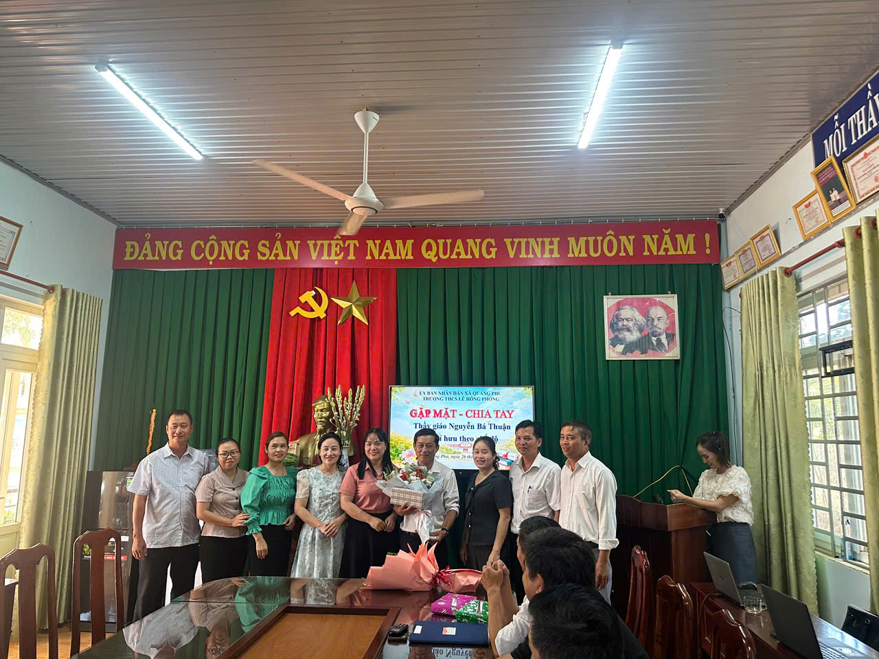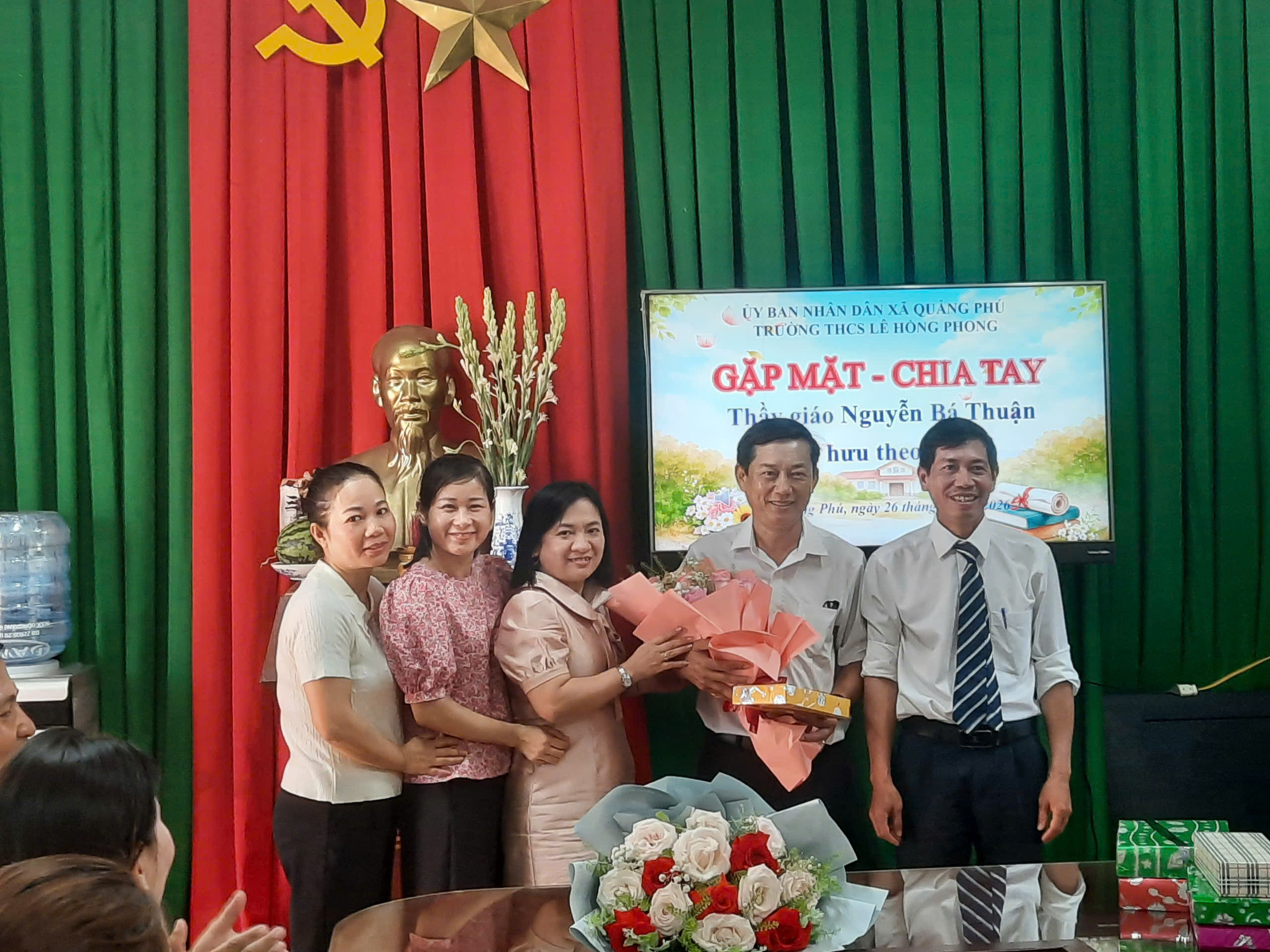 Trong buổi gặp mặt chia tay hôm nay các tổ chuyên môn Khoa học tự nhiên, tổ Toán Tin, tổ Tiếng Anh-Âm nhạc-Mỹ thuật, tổ Ngữ Văn-Lịch sử-Địa lý, tổ văn phòng cũng có những bó hoa, mon quà đầy ý nghĩa tặng thầy Nguyễn Bá Thuận.