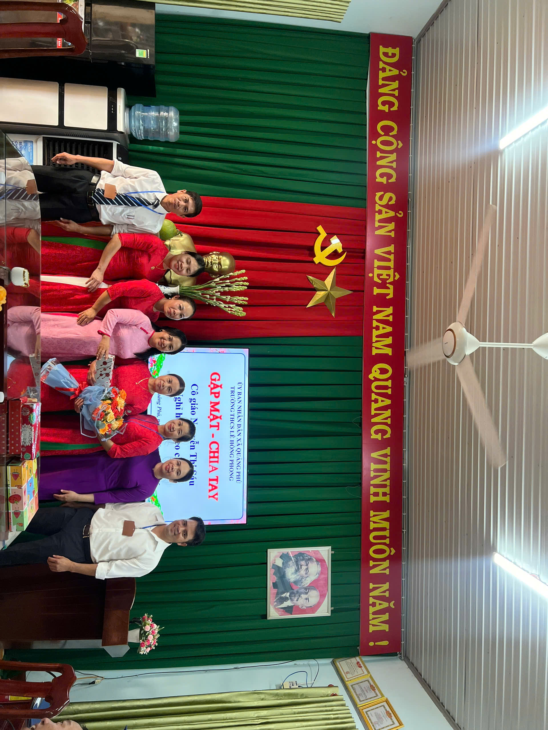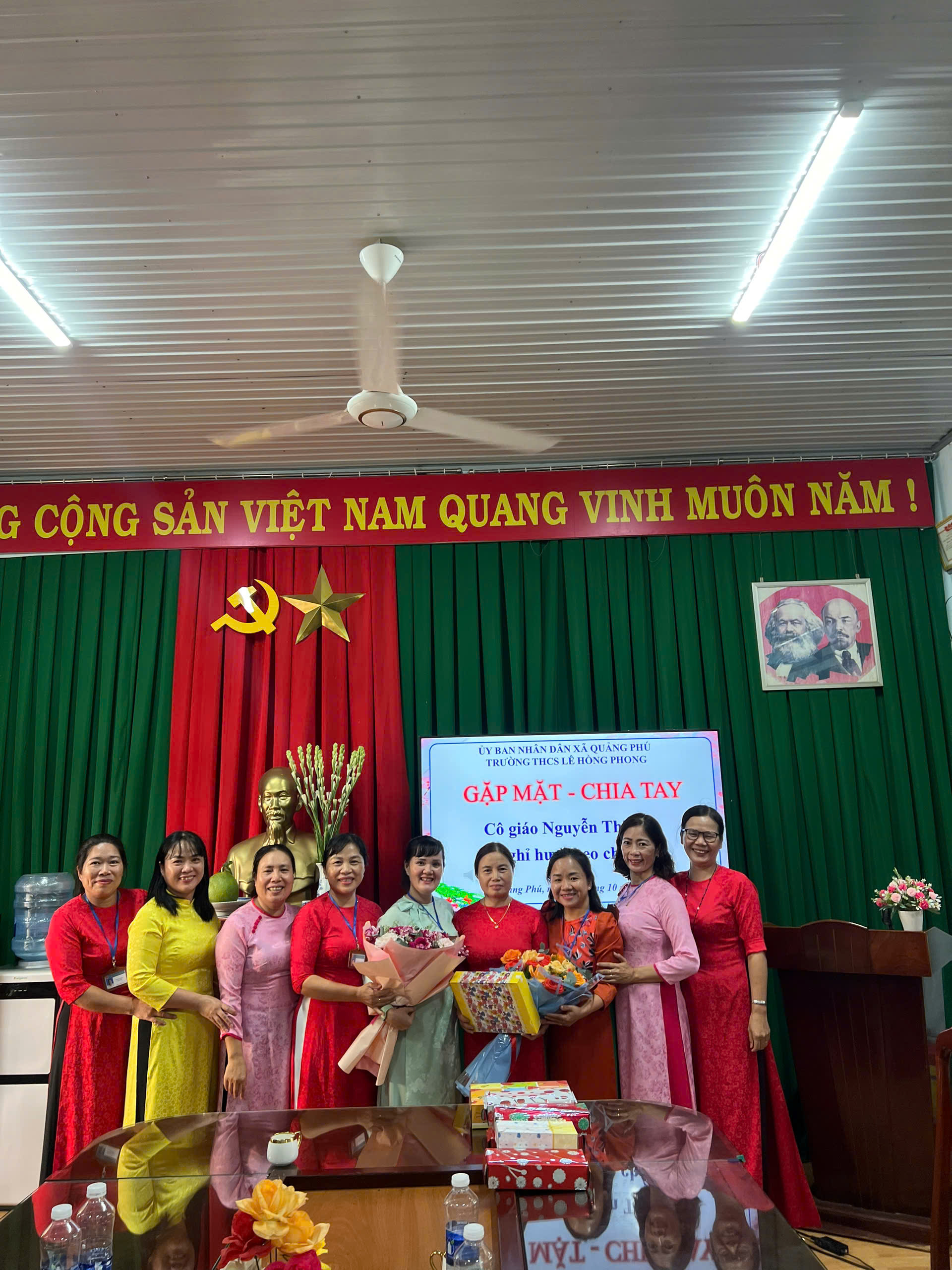 Trong cuộc đời mỗi con người ai cũng phải trải qua thời gian học tập, đi làm và rồi thay đổi nơi làm việc và công tác. Biết bao gắn bó và có nhiều kỉ niệm tốt đẹp không thể nào quyên., tập thể HĐSP nhà trường tận tâm tận tuỵ hoàn thành tốt nhiệm vụ vẻ vang của mình, góp phần cùng với nhà trường thực hiện thắng lợi nhiệm vụ qua các năm học, đưa thành tích của nhà trường ngày một đi lên. Với sự nỗ lực phấn đấu, sự cống hiến về trí tuệ, về sức khoẻ cho sự nghiệp trồng người, hôm nay cô Nguyễn Thị Sáu được nhà nước cho nghỉ hưu theo chế độ. Để ghi nhận công lao đóng góp của cô trong thời gian công tác tại trường đồng thời để lưu giữ lại những kỷ niệm tốt đẹp nhất với các đồng nghiệp, học sinh của mình trong môi trường sư phạm này. Hôm nay Nhà trường long trọng tổ chức buổi gặp mặt chia tay cô Nguyễn Thị Sáu nguyên là giáo viên nhà trường về sinh hoạt tại địa phương nơi cư trú, đó chính là lí do của buổi gặp mặt hôm nay.