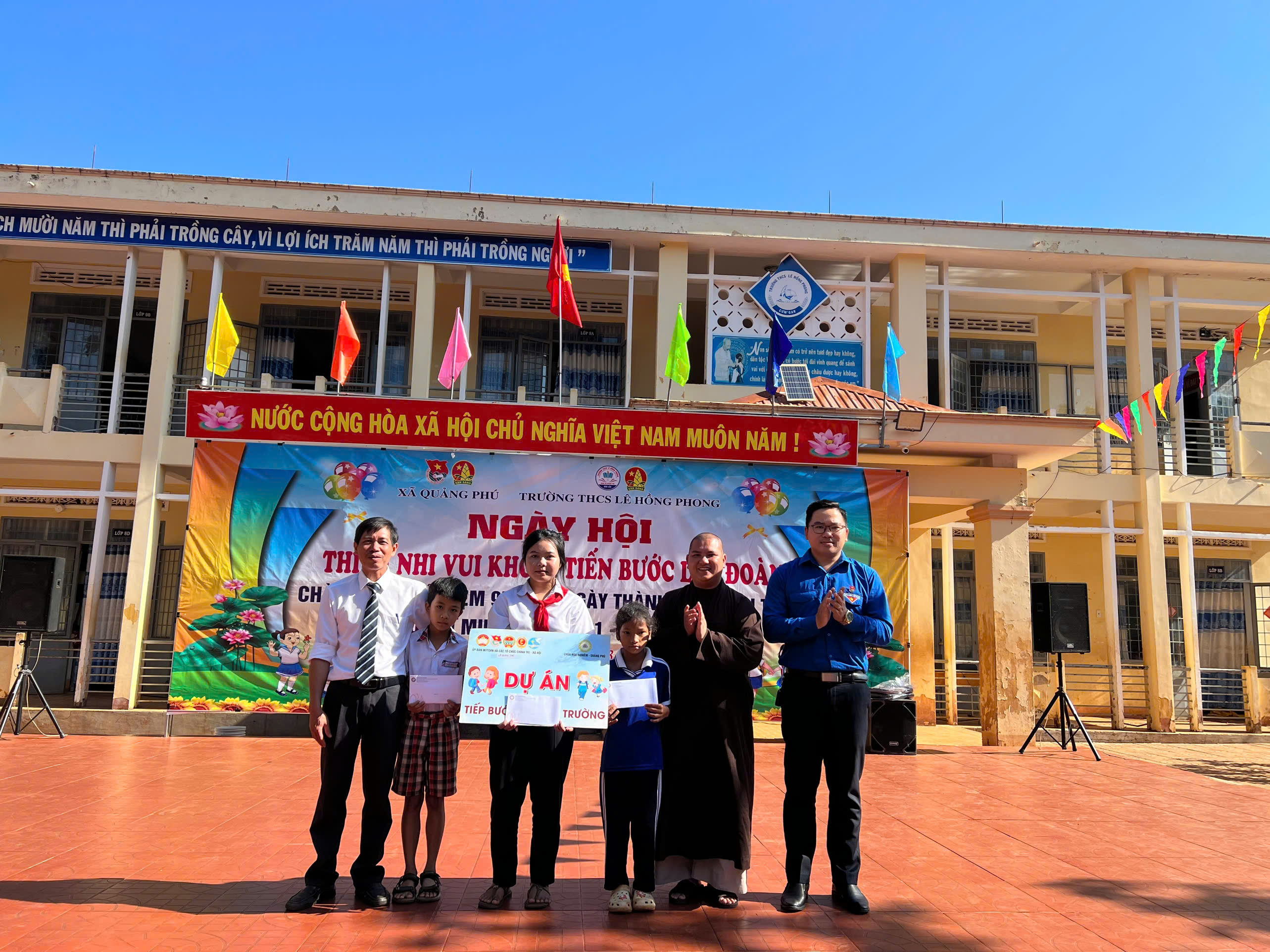 Trong không khí vui tươi, sôi nổi của Ngày hội “Thiếu nhi vui khỏe – Tiến bước lên Đoàn”, chùa Hoa Nghiêm trao tặng 3 suất học bổng cho 3 em trường THCS Lê Hồng Phong, trường Tiểu học Lê Thị Hồng Gấm và trường Tiểu học Phạm Hồng Thái. Với tinh thần từ bi, sẻ chia và luôn đồng hành cùng sự nghiệp giáo dục hôm nay nhà chùa trao tặng những suất học bổng thiết thực đến các em học sinh có hoàn cảnh khó khăn, góp phần động viên, khích lệ các em nỗ lực vươn lên trong học tập.