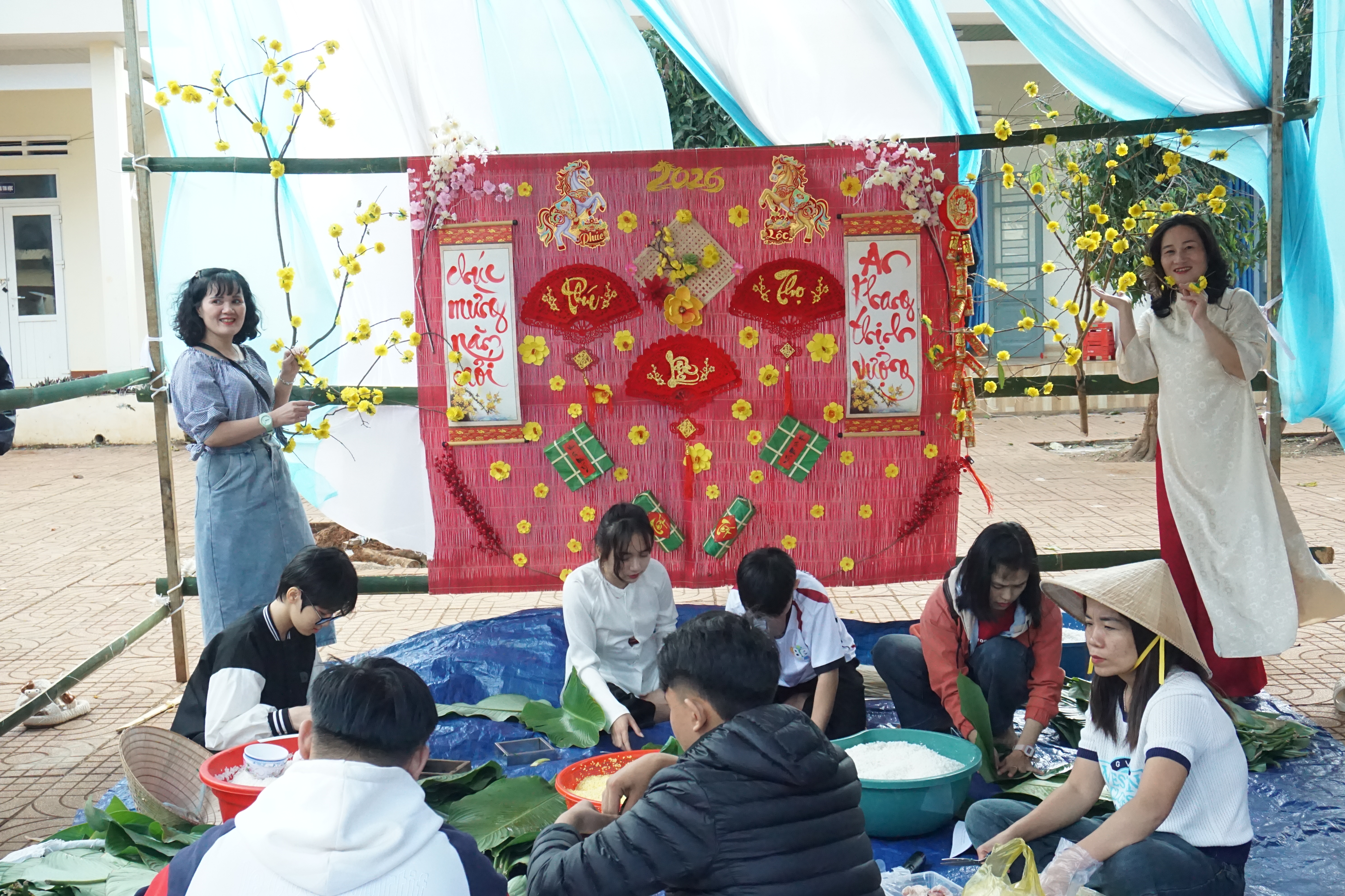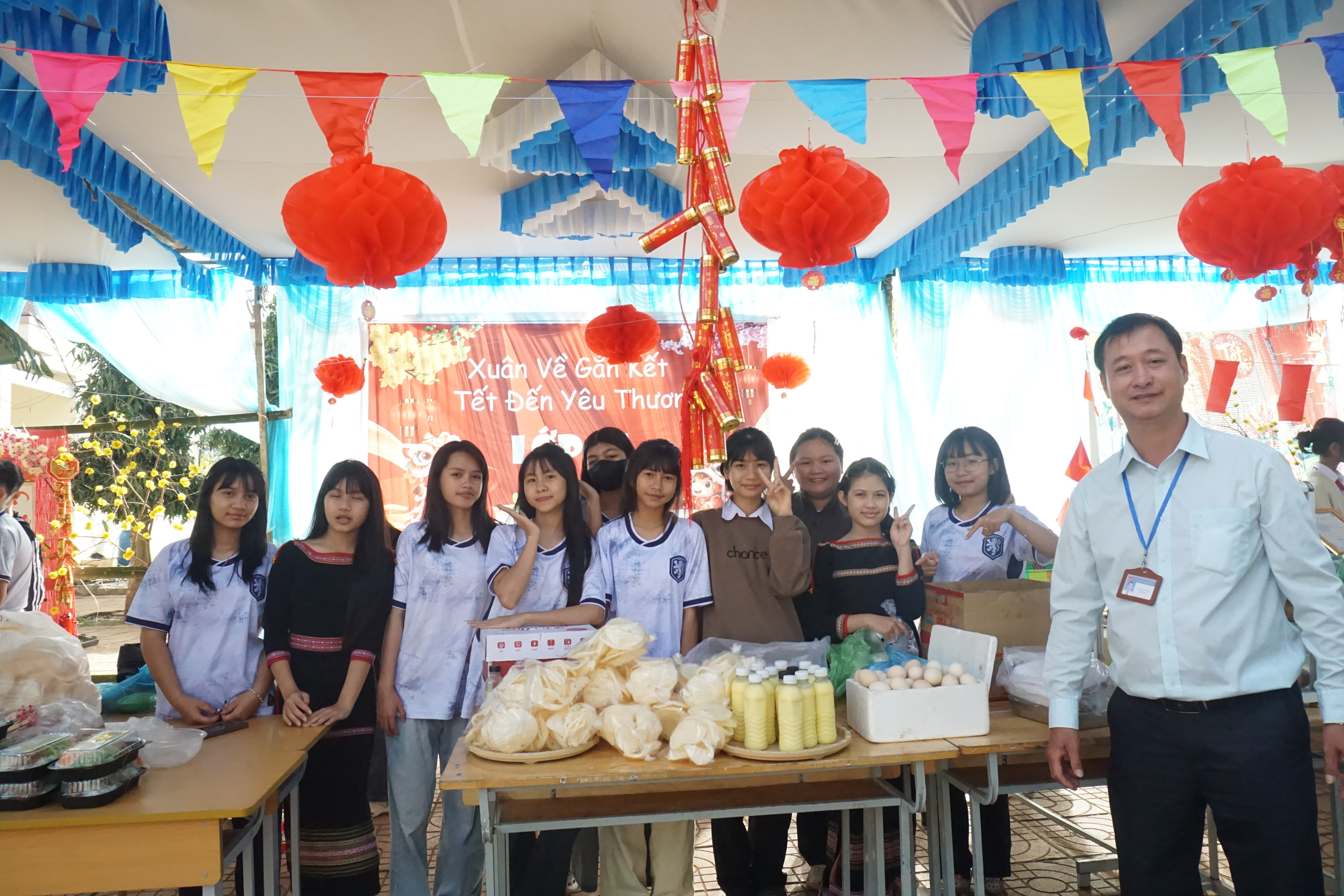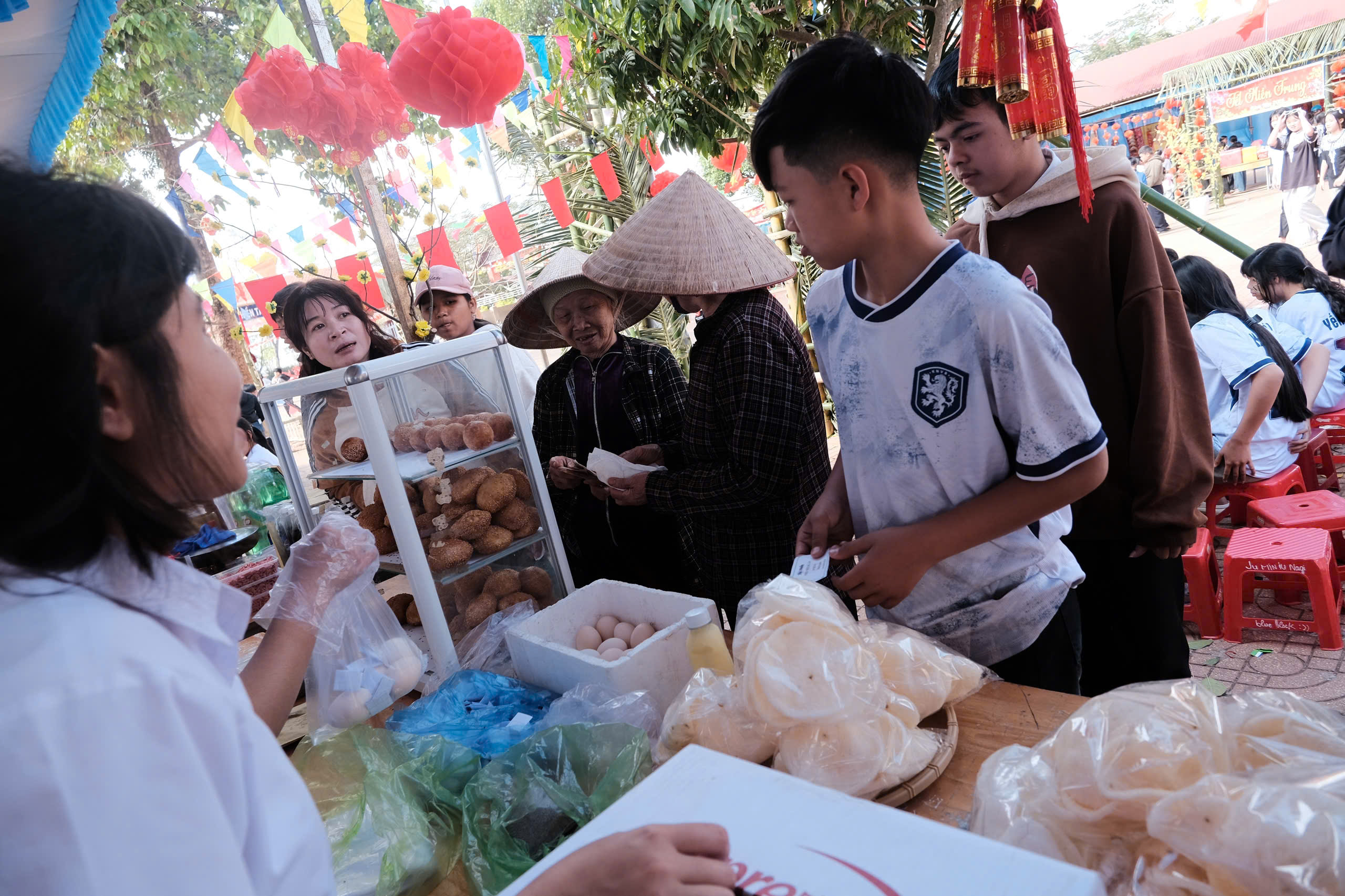 Điểm nhấn của chương trình là Phiên chợ Tết “Chia sẻ yêu thương” với nhiều gian hàng phong phú, do các lớp tự tay chuẩn bị và trang trí. Các gian hàng bày bán đa dạng sản phẩm mang đậm hương vị ngày Tết như: bánh chưng, bánh tét, mứt Tết, trà, đồ ăn vặt…. Không khí phiên chợ diễn ra vô cùng sôi nổi, rộn ràng tiếng cười nói, tạo nên một bức tranh Xuân ấm áp và gần gũi.