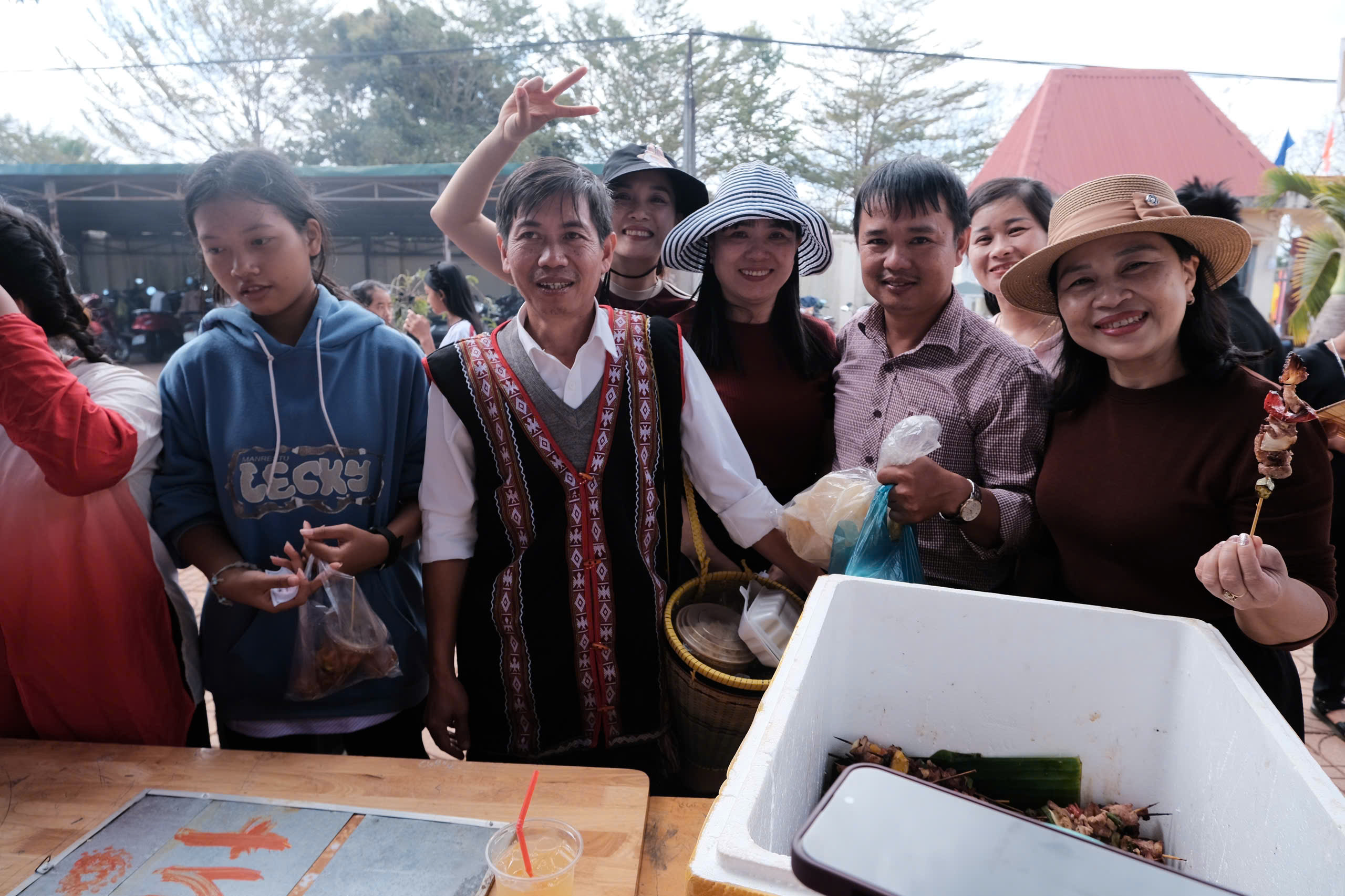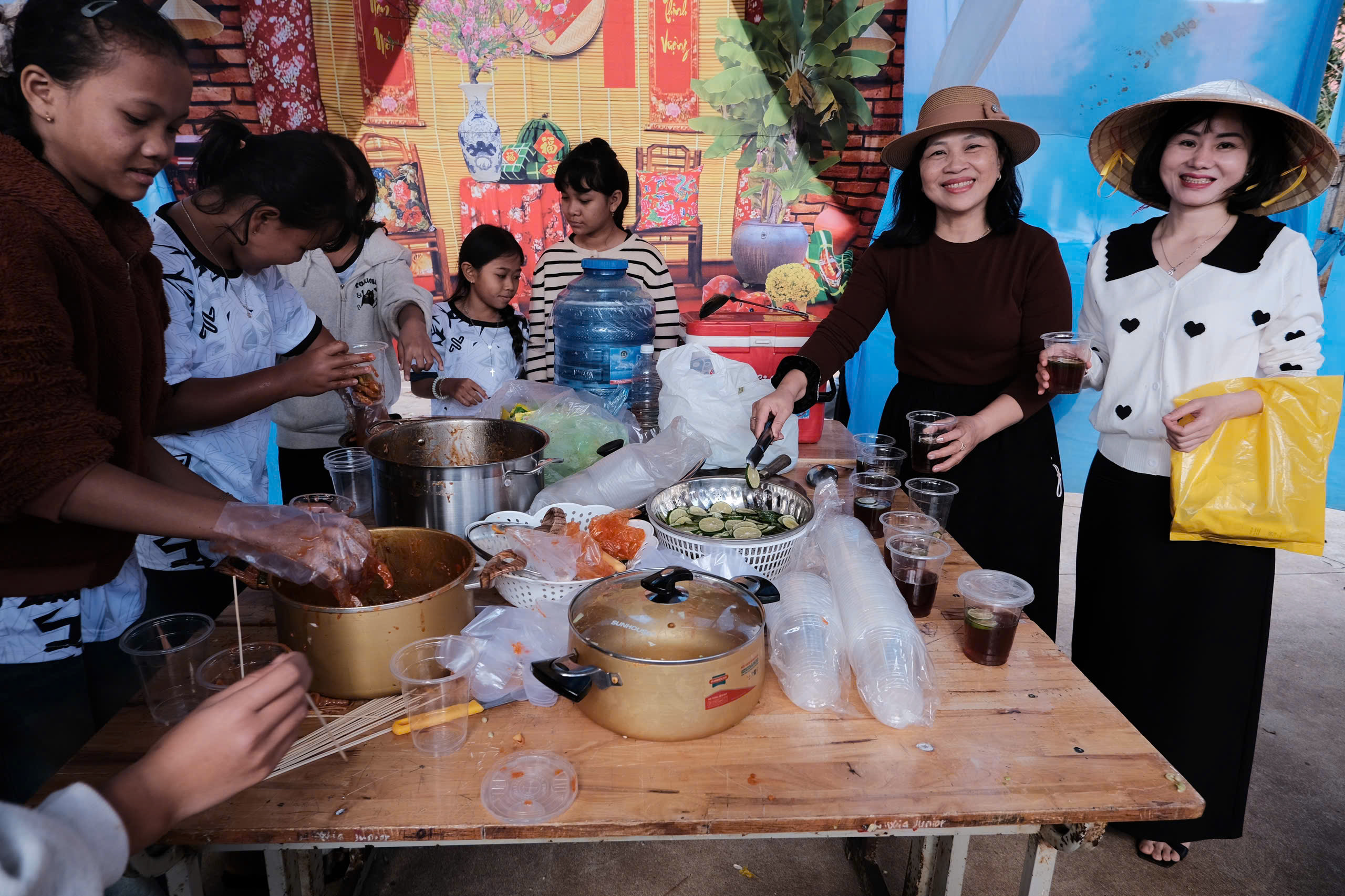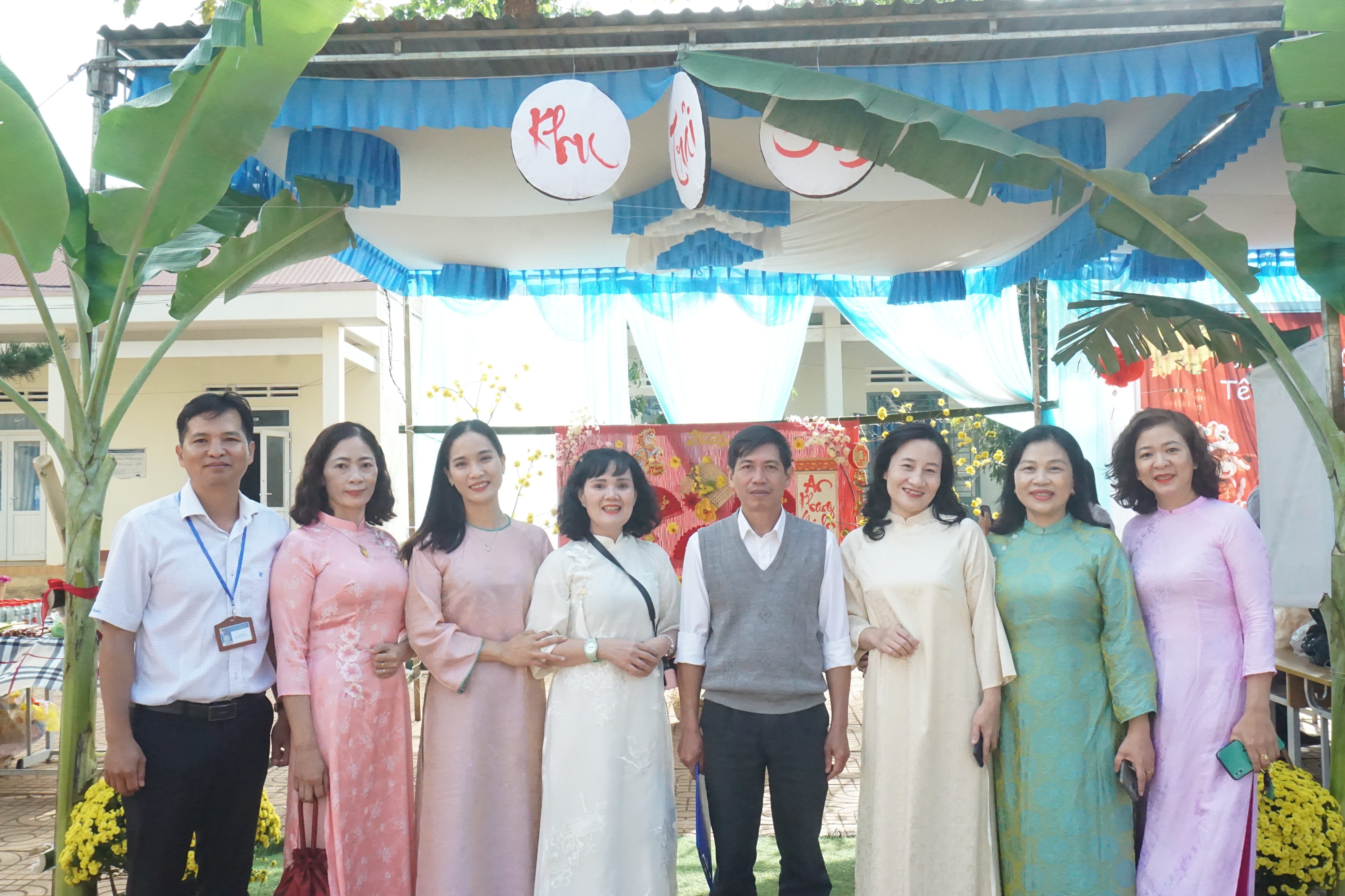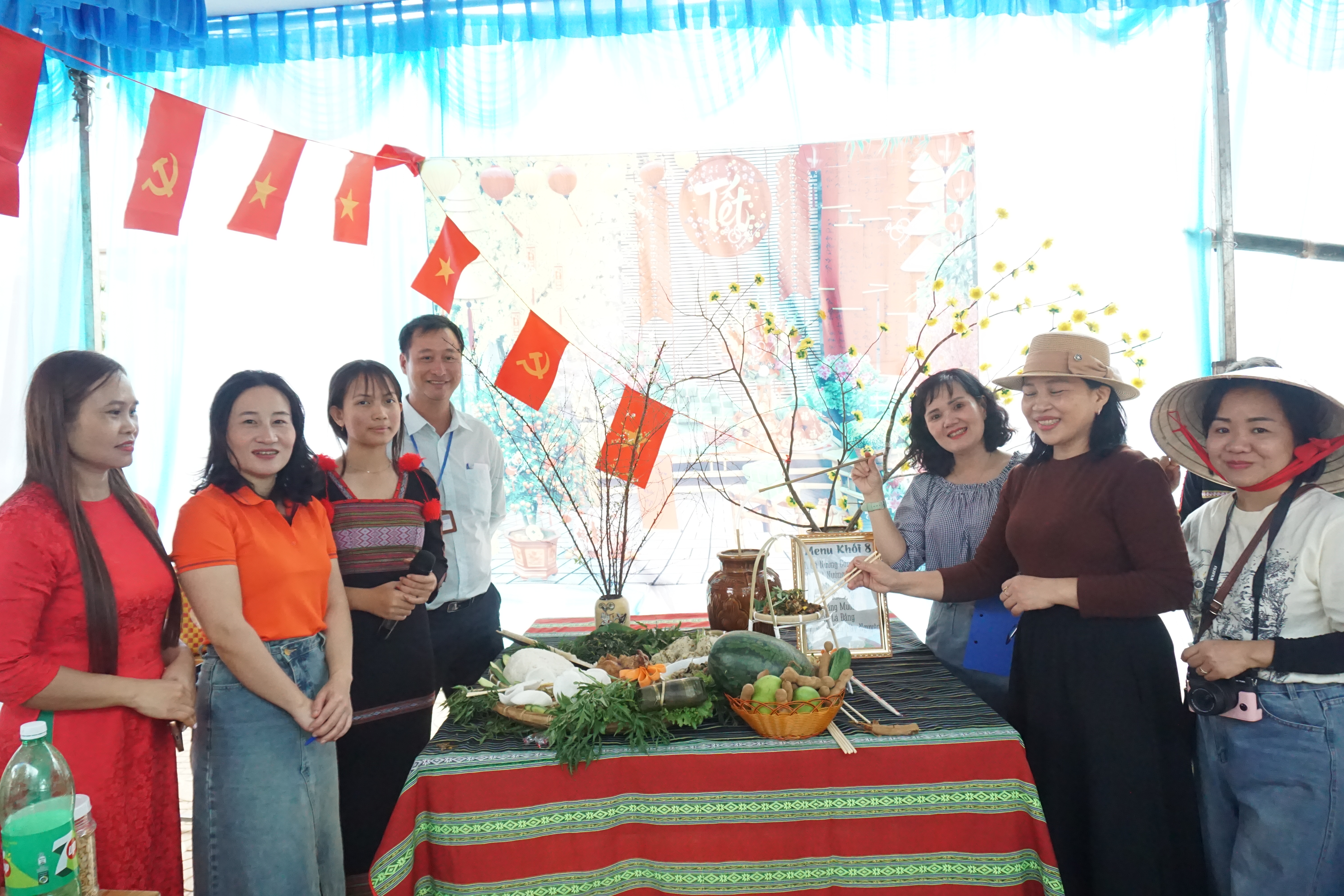 Điểm nhấn của chương trình là Phiên chợ Tết “Chia sẻ yêu thương” với nhiều gian hàng phong phú, do các lớp tự tay chuẩn bị và trang trí. Các gian hàng bày bán đa dạng sản phẩm mang đậm hương vị ngày Tết như: bánh chưng, bánh tét, mứt Tết, trà, đồ ăn vặt…. Không khí phiên chợ diễn ra vô cùng sôi nổi, rộn ràng tiếng cười nói, tạo nên một bức tranh Xuân ấm áp và gần gũi.